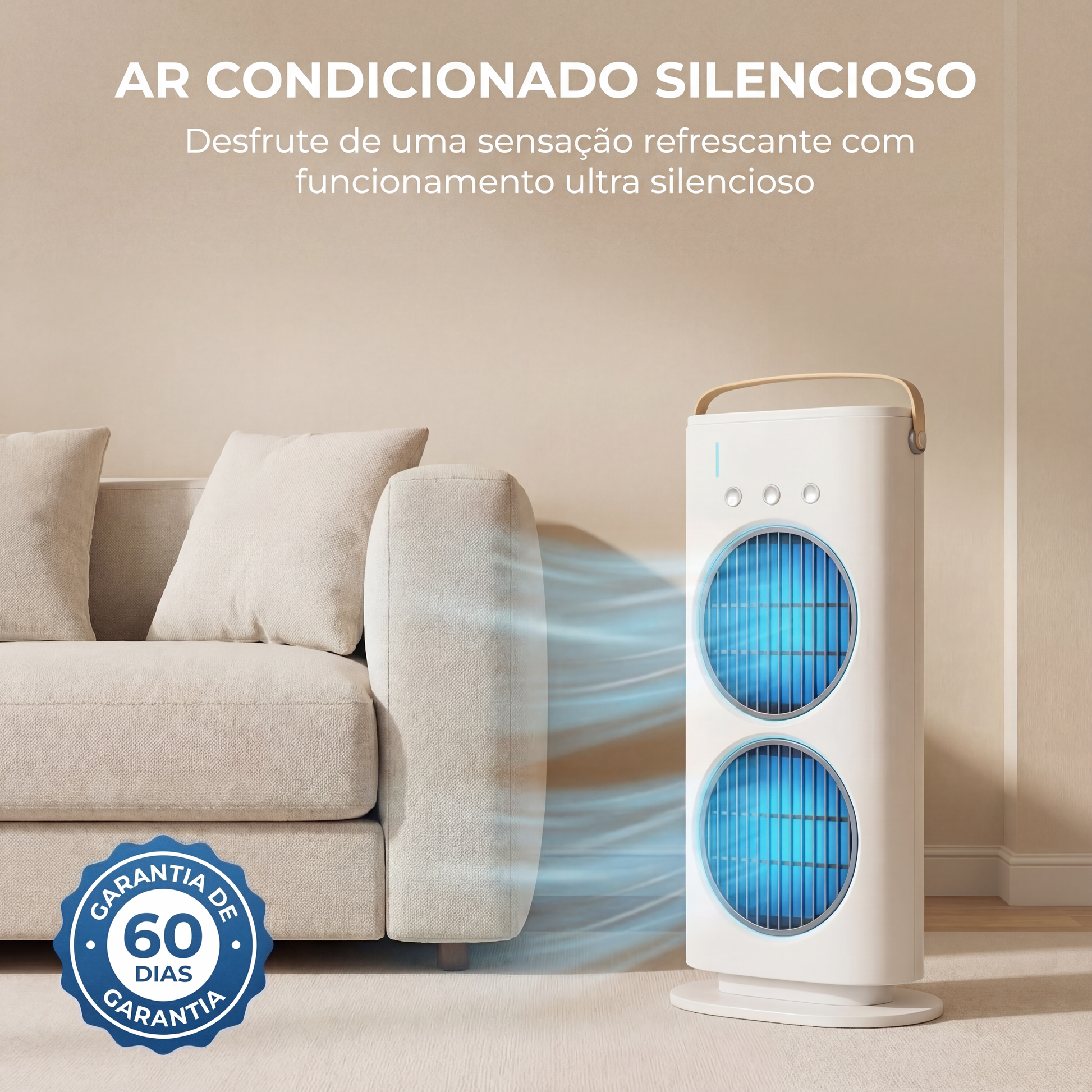 Cobertura para ambientes de 37 a 46 m², dependendo do isolamento do local. Ideal para refrescar áreas próximas como mesa de trabalho, cama, sofá ou estação de estudo, oferecendo conforto direto e imediato.