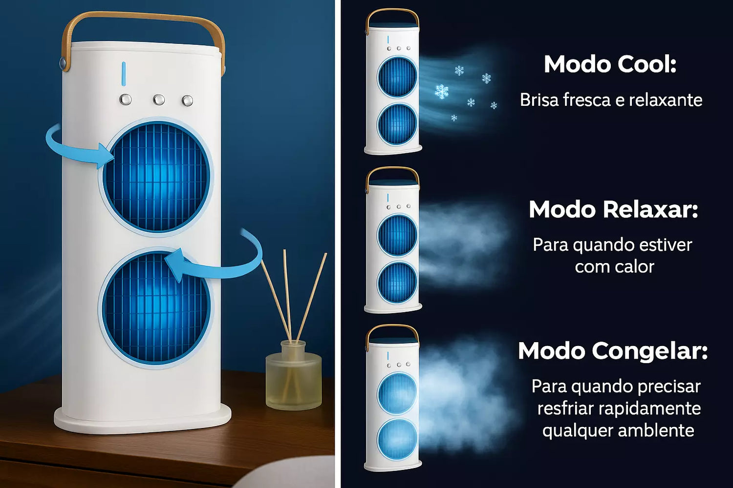 Compacto, eficiente em energia, portátil e de uso diário para resfriar, umidificar e melhorar o conforto do ar, com funcionamento silencioso.
